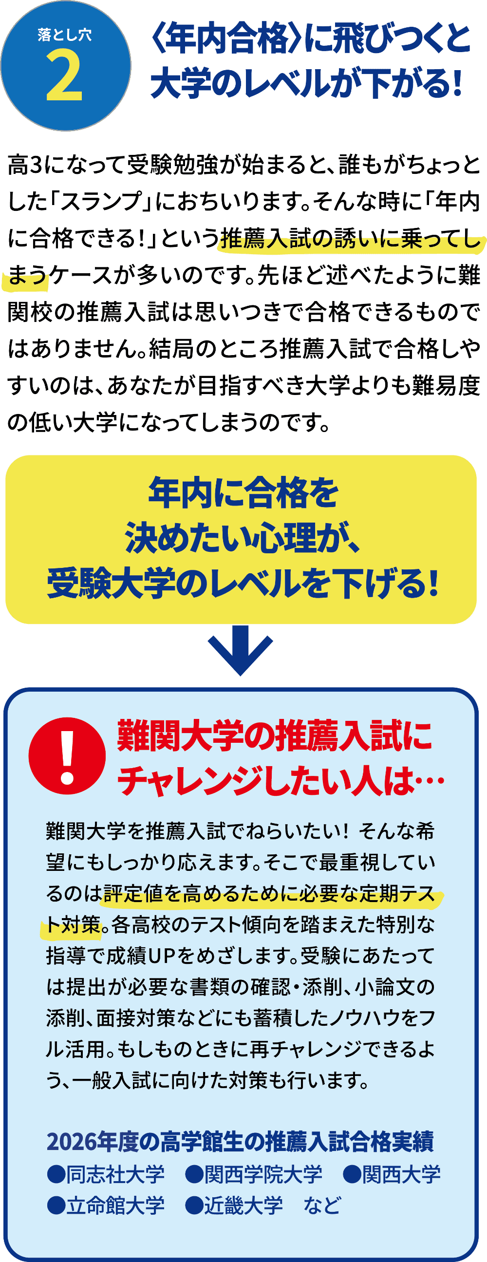 実は推薦型入試には落とし穴があります。今回はこの落し穴に落ちることなく高いレベルの志望校に現役合格する秘訣をお伝えしたいと思います。しっかり読んで「推薦入試は大学への近道」という誤解をひっくり返してください。